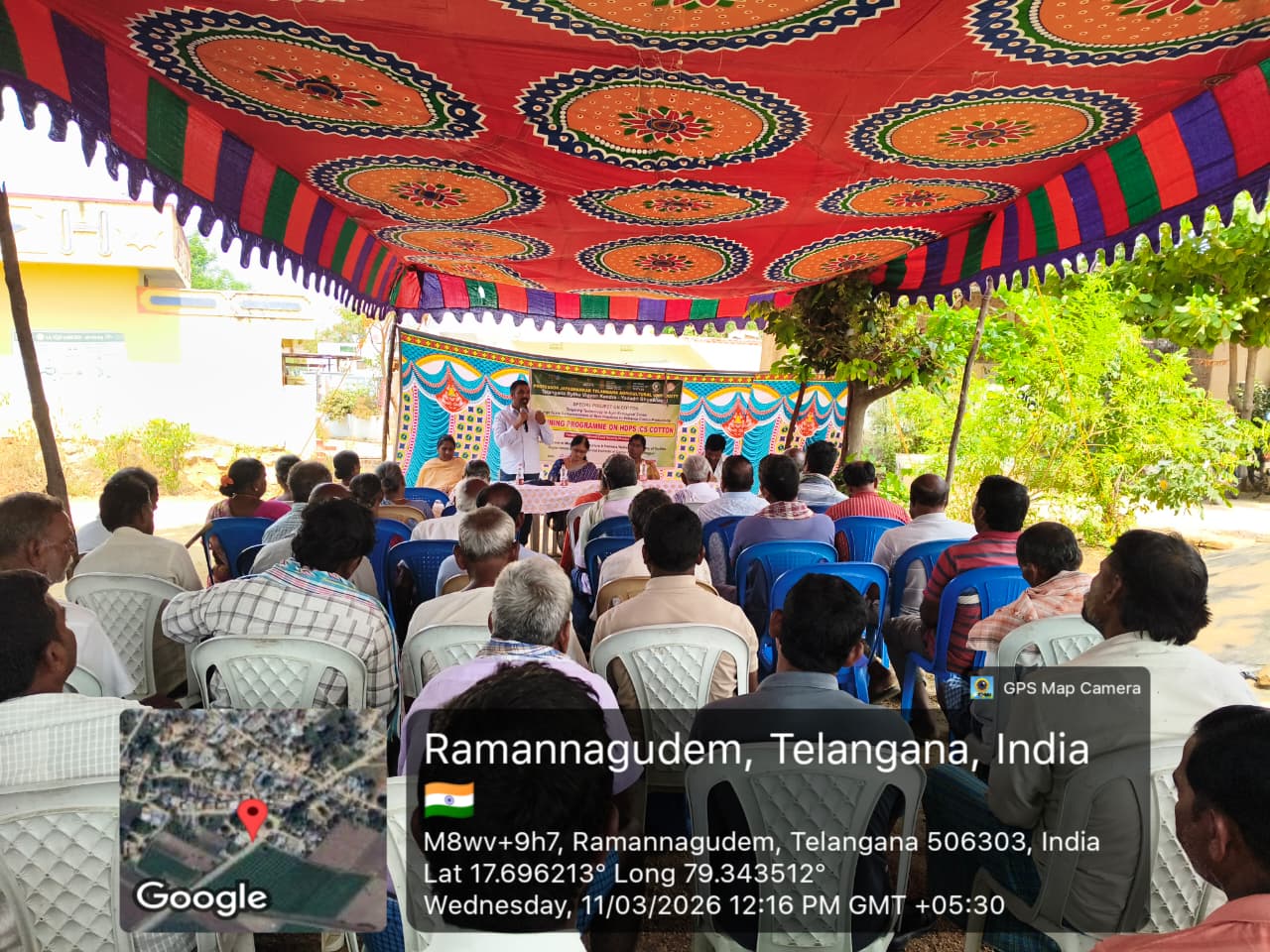 Under the auspices of Professor Jayashankar Telangana State Agricultural University and Telangana Rythu Vigyana Kendram – Yadadri Bhuvanagiri district, a training programme on “High Density Cotton Cultivation Practices” was conducted at Ramannagudem village of Raghunathpalli mandal in Jangaon district on 11th March,2026 as part of the special project of the Central Institute for Cotton Research. Dr. D. Srilatha, Principal Scientist and Coordinator, TRVK, explained the concept of High Density Planting System (HDPS) in cotton and briefed farmers about the project objectives. She informed that in HDPS the spacing between rows and plants is reduced so that more plants can be accommodated per acre. By maintaining about 25,000–35,000 plants per acre, farmers can obtain 9–13 quintals yield per acre under rainfed conditions. She further stated that farmers adopting this method will receive an incentive of ₹5,000 per acre from the Central Government, which will be credited to their bank accounts. She also explained that synchronous harvesting helps reduce the damage caused by pink bollworm. The use of a pneumatic planter for sowing ensures uniform spacing and depth of seeds, improves germination, and reduces labour costs by about 40%, resulting in uniform crop maturity. Further,a five Front Line Demonstrations(FLD's) were conducted in 5 farmer's fields each one acre to evaluate the performance of sesame variety JCS-2454, released from RARS Jagtial.Dr Srilatha informed that the advantages of cultivating sesame as a third crop during summer were explained to the farmers.Farmers later visited the sesame field and showed willingness to cultivate sesame in their fields. Dr. Venkata Rajkumar, Scientist from TRVK Warangal, explained important management practices in chilli cultivation. AEO Kalpana, Sarpanch Aliveelu, Vice-Sarpanch V. Bhaskar and G. Ramakrishna Reddy also addressed the farmers during the programme. A large number of farmers participated in the programme and expressed their willingness to adopt HDPS in cotton cultivation. Farmers also showed interest in using a cotton shredder instead of burning cotton stalks after harvest and incorporating them into the soil.