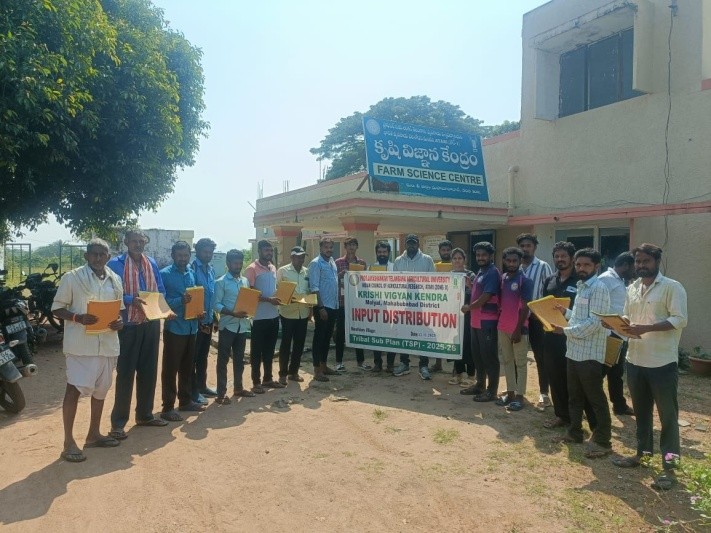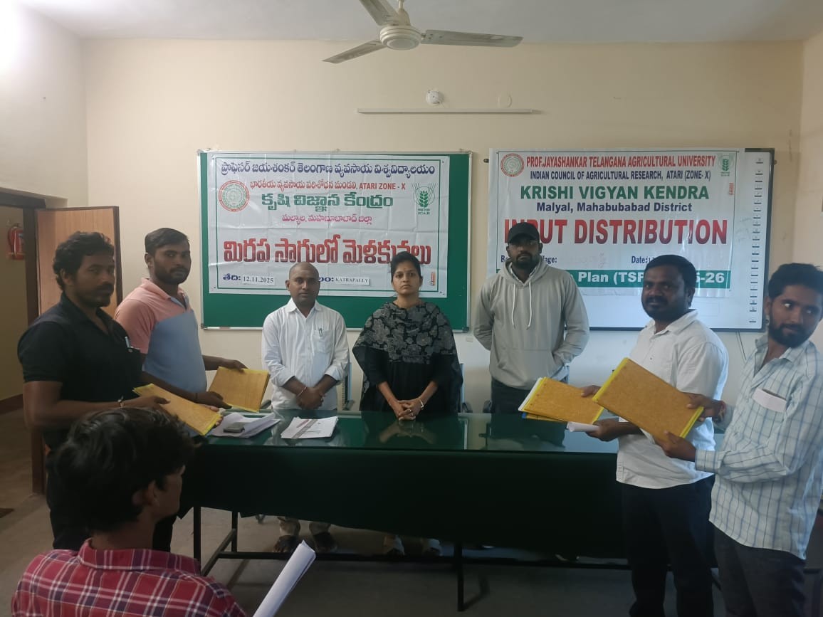 Krishi Vigyan Kendra, Malyal organized a farmer training programme on “Mirapa sagulo melakuvalu” and Input distribution (Sticky traps (Yellow, Blue and White) to the farmers of Katrapally village of Kesamudram Mandal Under TSP project at KVK, Malyal on 12.11.2025. In this connection, L.Suhasini, SMS (Horticulture) explained about different management practices in chilli and IPD and IDM practices of chilli and B. Kranthi Kumar, SMS (CP) explained about usage of sticky traps in the field. K. Nagaraju, Head & Scientist of HRS, Malyal explained about important cultural practices followed in the chilli crop. Later sticky traps were distributed to the farmers. A total of 25 farmers were participated in this programmed