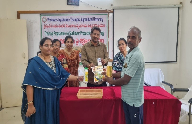 A Training programme on “Production technologies of rabi sunflower along with “Field day on rabi Sunflower” was organized at ARS, Tornala on 19-02-2026 by Agricultural Research Station, Tornala. In this programme, Dr. G. Santhosh Kumar, Scientist (Agro.) and Head, ARS, Tornala highlighted on importance of alternate crops to rice during rabi season and their economic viability and importance of oilseeds in crop diversification. Dr. D. Swetha, Scientist (Agro), ARS, Tornala explained about characteristics of sunflower hybrid seed (Tillhan tech SUN H-1) such as duration 90-95 days, with yield potential of 9-11q/ac with oil content of 39-40%. She also enlightened farmers about importance of secondary and micro nutrients in sunflower production, production technologies in sunflower. Dr. A. Ramadevi, Scientist (Ento.), explained about pest and disease management in sunflower. Smt. G. Neelima, Scientist (Pl. Br), encouraged farmers regarding seed production, important aspects of seed production such as time and isolation distance maintenance in sunflower cultivation. Smt. A. Saritha, Scientist (Pl. Br) explained about paddy and pulses seed production Later, farmers have raised problems in cultivation of sunflower and scientists suggested solutions. Further, a field day was organised followed by inputs viz., borax, neem oil, corazen and reflective ribbon were distributed to the sunflower FLDs beneficiaries. The programme was attended by farmers of Mantoor and Anajipur villages.