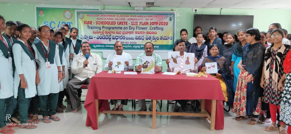 Training programme on Dry flower crafting was held on 20.02.2020 as a part of SC sub plan project. In this training, ladies, UG and PG college girls (VKDVS Degree College and AWARE polytechnic college) were invited from Adopted village- Narayanapuram, Peraigudem and Aswaraopet. Programme was started by Associate Dean, Dr. C. Narendra Reddy by lighting the lamp and was forwarded by Dr. I. V. Srinivasa Reddy. In this programme other teaching were actively took part in delivering various lectures viz., Economic importance, Status and Scope of Dry flower industry was delivered by Dr. P. Neelima, Methods of Flower preservation by Dr. I. V. Srinivasa reddy and Entrepreneurial avenues of Dry flower industry by Dr. K. Sireesha were delivered and in the afternoon session Hands on training was conducted, in this trainees has prepared various dry flower products viz., greeting cards, frames, wreaths, hair dress, floral bangles, potpourris etc.