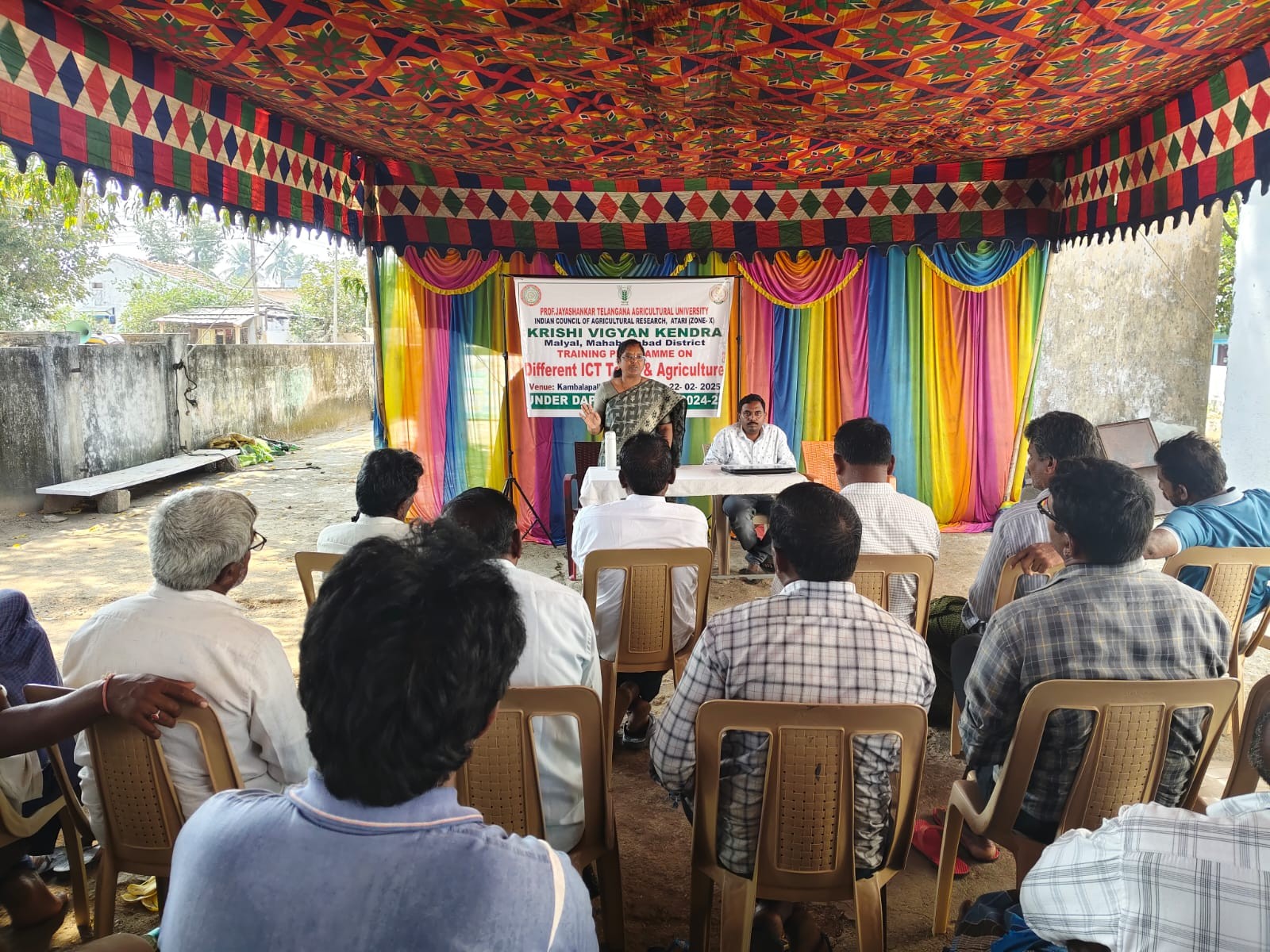 A Training Programme on “Use of different ICT tools in Agriculture” Under DAPSC Project 2024-25 was conducted by Krishi Vigyan Kendra, Malyal at Kambalapalli village on 22-02-2025. In this programme Dr. N. Kishore Kumar, SMS (Extension) explained about “Different ICT tools in Agriculture” Mobile Apps like Kisan suvidha, Pusa krishi mobile app, Bhuvan hail strom app, Plantix, IFFCO Agriculture, TS Wheather app etc., different portals like Telangana Agris net, Rice knowledge management portal, e-NAM, eSpice Bazaar etc., different YouTube channels in agriculture and allied sector, demonstrated subscription of PJTAU YouTube channel and downloading of different mobile applications. Dr. S. Malathi, Programme Coordinator, KVK, Malyal addressed the gathering about importance of mobile apps in solving the problems in the farm itself and explained about pest and disease problems in Yasangi crops like, Paddy, Maize & Greengram and precautionary measures. In this programme 38 farmers from Kambalapalli village participated.