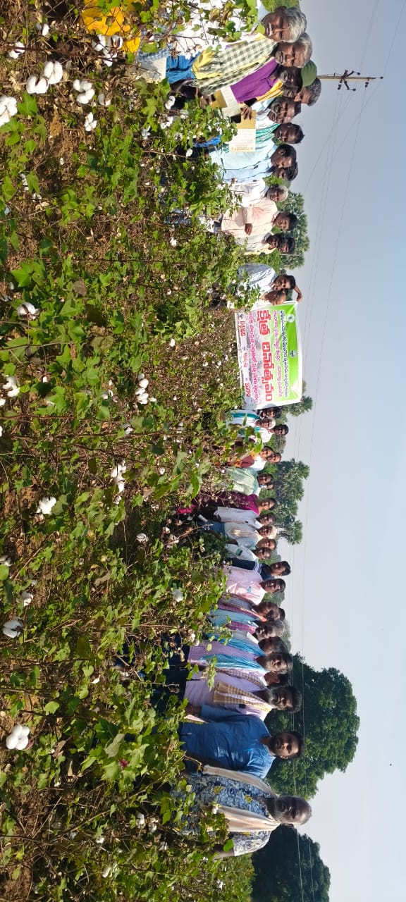 Telangana Rythu Vigyan Kendra(TRVK),PJTAU, Yadadri Bhuvanagiri District conducted a field day on high density planting system (HDPS)in cotton on 17th November 2025 at the field of Sri.Sheri Somireddy in Kannaipally village, Raghunathapalli Mandal, Jangaon District.The event was conducted as part of a special project by the Central Institute of Cotton Research (ICAR-CICR), Nagpur. At the out set Dr.D.Sreelatha, Principal scientist and Coordinator addressed gathering and briefed about the project details and incentives offered by Central Government @5000/- as a direct benefit to the farmer adopted HDPS Cotton during Kharif 2025-26. She also created awareness on cultivation practices of HDPS cotton particularly on selection of varities, spacing, fertilizers, weed and canopy management. The young professional Ms R.Rupa explained about the IPM practices for Pink boll worm, Helicovarpa and other sucking pest control management. In this program Agriculture Officer sri A.Srinivas Reddy, REAC member CTZ, Sri Yadagiri,AEO Smt.Kalpana, Young professionals Venu, Rupa, Rajesh, Bhanu Chander and progress farmers and more than 100 cotton farmers participated in the field day and witnessed the performance of HDPS Cotton farmer field.