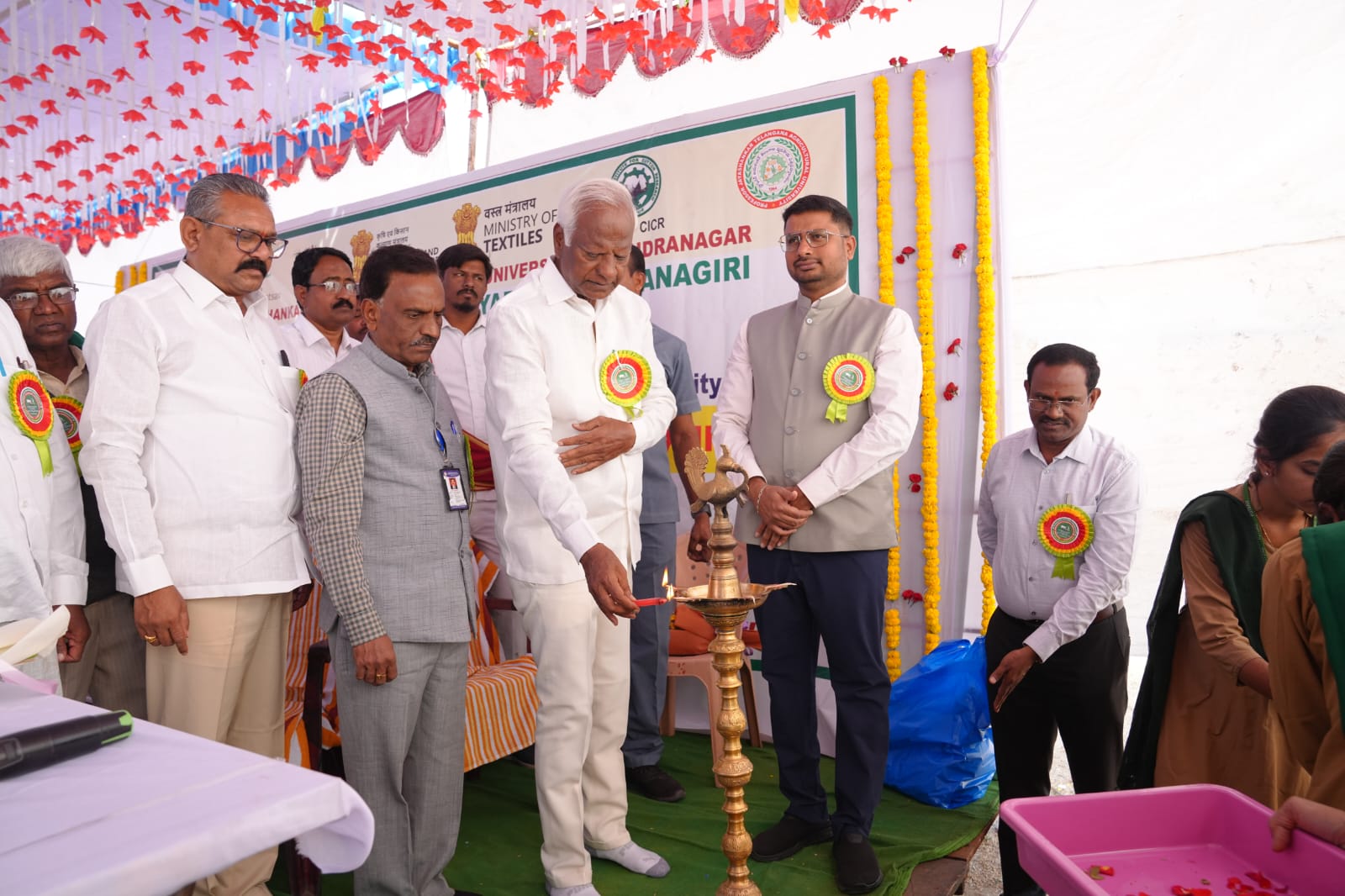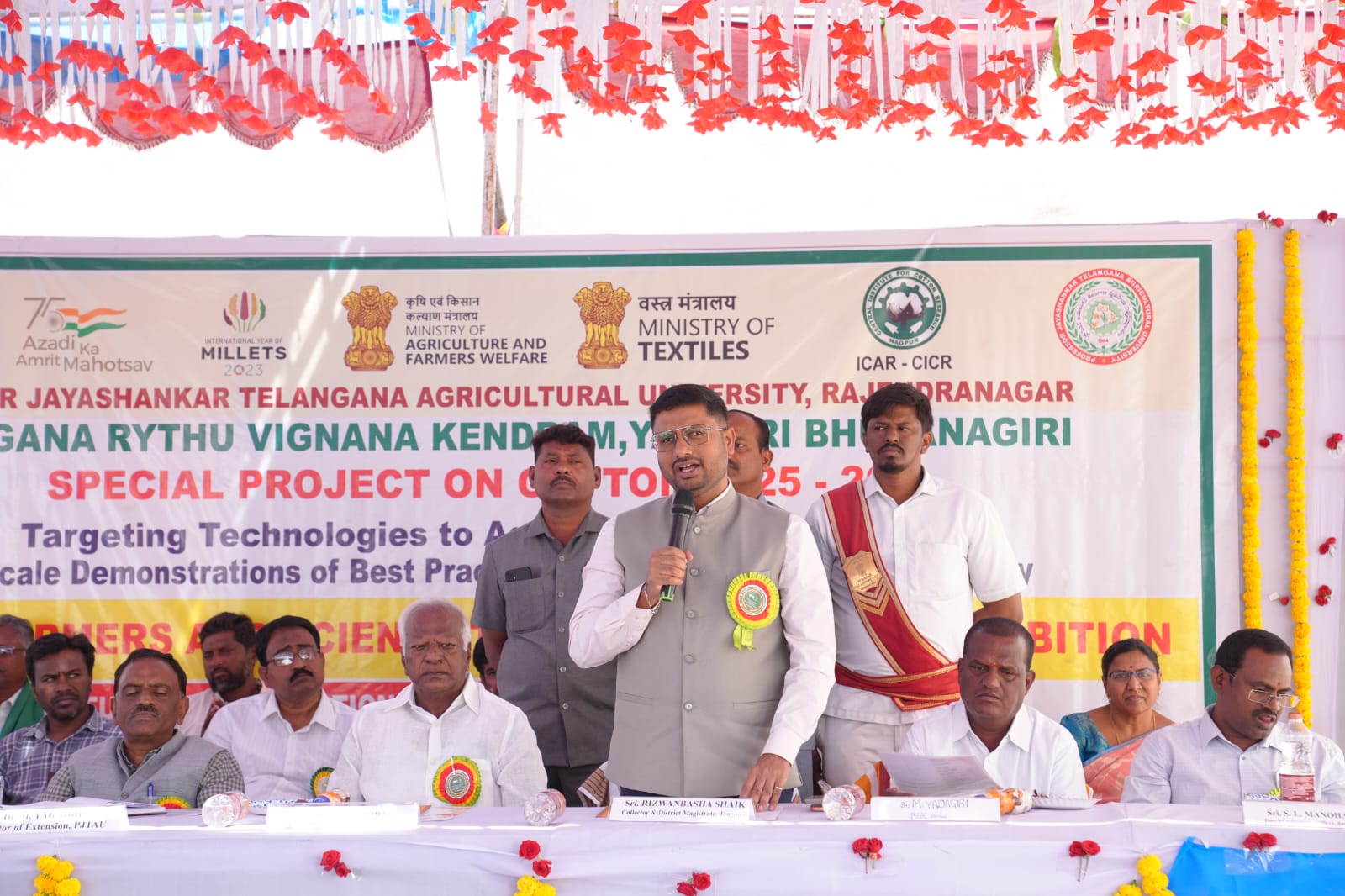 Telangana Rythu Vignan Kendra (TRVK), PJTAU, Yadadri Bhuvanagiri, organized a "Kisan Mela and Farmer-Scientist Interaction Meeting cum Exhibition" on 23rd, December 2025. The event was conducted as part of a special project on Cotton under the Central Institute for Cotton Research (ICAR-CICR), Nagpur. The program was graced by Chief Guests Hon'ble MLA of Station Ghanpur constituency, Sri Kadiyam Srihari and District Collector and Magistrate of Jangaon District, Sri Rizwan Basha Shaik, IAS.Dr. D. Sreelatha, Principal Scientist and Coordinator of TRVK, welcomed the gathering and elaborated on the primary objectives of the Kisan Mela, emphasizing the need for technology adoption. Hon'ble MLA, Sri Kadiyam Srihari Emphasized that scientific research must move "from lab to land" to make farming profitable. He urged farmers to adopt crop rotation, maintain soil health, and use chemical fertilizers judiciously. District Collector, Sri Rizwan Basha Shaik Encouraged farmers to achieve economic stability by embracing modern technologies, specifically the High-Density Planting System (HDPS) in cotton and organic farming practices. Director of Extension, PJTAU Dr. M. Yakaadri Stated that the university's goal is to ensure research results reach farmers directly. He advised farmers to utilize extension services to modernize their agricultural practices. Dr. G. Veeranna, Principal Scientist (RARS, Warangal), educated farmers on HDPS Cotton, explaining how it enables higher yields in a shorter duration. Dr. P. Rajaiah, Principal Scientist (Agricultural Engineering), discussed modern farm machinery designed to overcome labor shortages. Officials from the Agriculture, Horticulture, Fisheries, and Animal Husbandry departments detailed various government subsidies and the profitability of dairy and fruit orchards. In this program Progressive farmers, including Sri Kanchi Mallaiah, Mandadi Siddha Reddy, S. Somireddy, L. Srinivas, and Ramakrishna Reddy, shared their successful field experiences with HDPS cotton, motivating fellow farmers to adopt the system. The program saw participation from several key officials, including Sri P.V. Ramana Reddy (DAO, Yadadri Bhuvanagiri), Smt. M. Madhavi (DHSO, Yadadri Bhuvanagiri), Sri.B.Sridhar DHSO, Jangaon, Dr S.Muralidhar Rao District Veterinary Officer, Jangaon, Smt.Vasantha Suguna,ADA Station Ghanpur, Sri.A.Parashuram ADA, Palakurthy, Dr. N. Lingaiah (Principal Scientist, RARS Kumpasagar), Technical experts Dr.D.Veeranna, Scientist(Ento), Dr.V.Ramya Scientist (Path),RARS, Warangal, MAO and AEO's Jangaon and Bhuvanagiri districts,agricultural students of PJTAU,Young professionals of Cotton project and more than 470 farmers were participated.