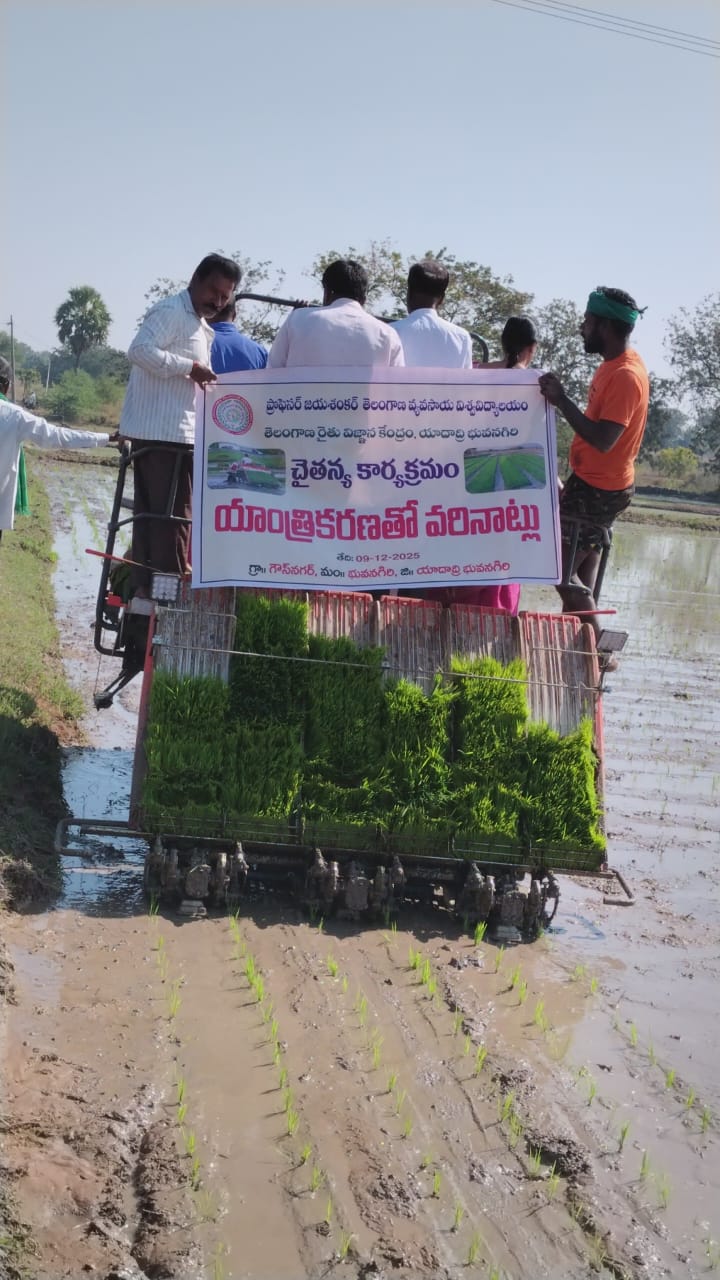 An awareness and Sensitisation program regarding mechanized transplantation was conducted by the Telangana Raithu Vignana Kendra (TKVK), Yadadri Bhuvanagiri, at Gouse Nagar village in Bhuvanagiri Mandal on 9th December, 2025. In response to the shortage of labor and escalating production costs towards traditional transplanting farmers, under the leadership of Shri Mandadi Siddareddy, Managing Director and Farmer Coordinator of the Farmer Producer Organization (FPO), have initiated the process of mechanized paddy transplantation in 18 villages of 100 acres of farmer fields during this Yasangi season.The advanced Kubota Paddy Transplanter was used to sow rice seedlings across and incurring hiring cost of rupees 4700 per acre for nursery raising and transplantation starting from December 7th. At this event, Dr. D. Srilatha, Principal Scientist and Coordinator of TRVK emphasized the dual benefits of mechanization as Mechanized paddy transplantation not only saves labor costs but also ensures that the seedlings are planted at the correct depth and proper spacing. This improves air circulation and penetration of better solar radiation among the plants, which reduces pest and disease incidence and ultimately leads to higher yields. She appreciated all the farmers who come forward for machine transplanting. Nearly 60 farmers are attended the program and expressed their satisfaction with kobota transplanter.