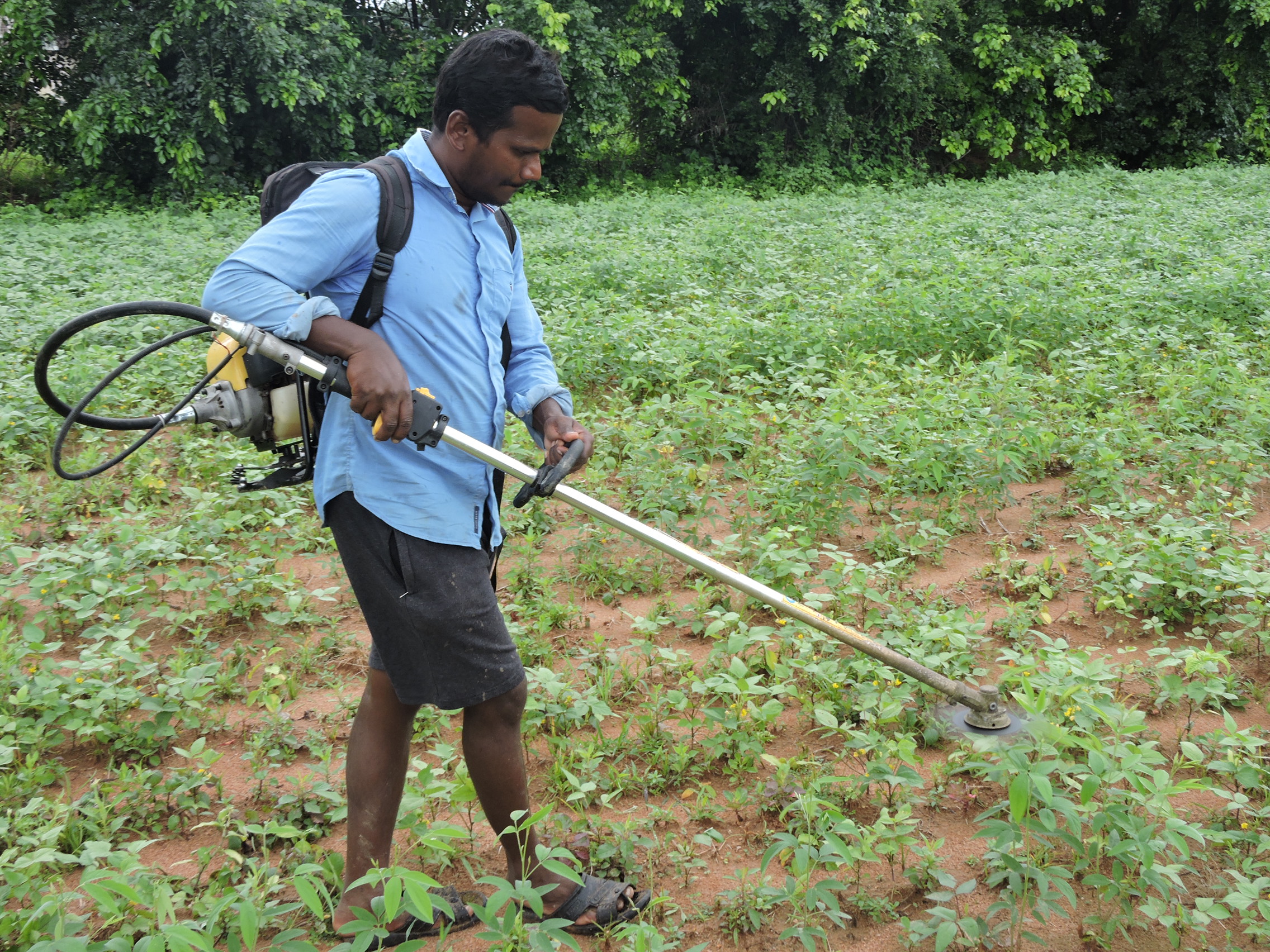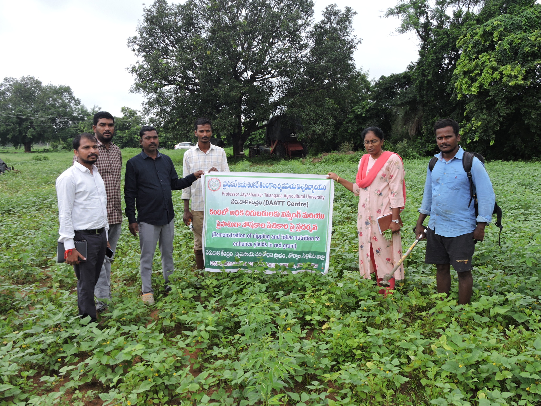 TRVK, Siddipet organized method demonstration cum awareness to farmers on nipping in red gram field of Sri. Kammari Swamy at Chittapur village, Akberpet Bhoompally Mandal Siddipet (Dt) on 13.08.2025. Dr. Ch. Pallavi, Coordinator, TRVK, Siddipet explained the gathering about nipping of the terminal bud in between 45 to 60 days of crop growth stage improve the source to sink, significantly reduced the height of the plant and improve the number of primary and secondary branches girth and pods per plant. The nipping operation of red gram crop has given yield increased up to 10-15 %. She suggested farmers not to apply excess fertilizers to redgram crop and manage the pest and diseases at flowering stage would helpful to increase the yield and irrigating at bud formation stage to make considerable yield increase. Further, nipping operation was carried out with the brush cutter in half an acre in 15 minutes by K. Swamy redgram field. In this programme, Satynvesh (MAO), Mahesh (AEO), 10 No. Progressive farmers participated.