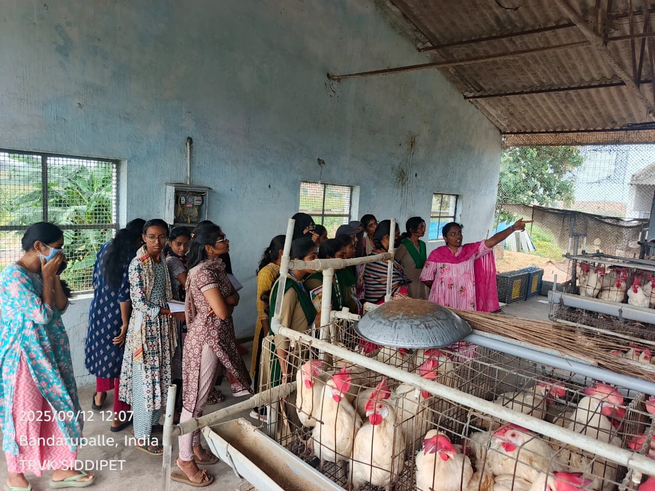 TRVK, Siddipet organized exposure visit to the RAWEP students of BJR, Agricultural College, Siricilla to Poultry farm of Sri. Vaikuntam at Ghanapur (V), Thoguta (M), Siddipet (Dt.) on 12.09.2025. Farmer Sri. Vaikuntam had explained poultry farming as a profitable yet demanding agro-business requiring careful management of housing, feed, and bird health, and often starting with low investment to grow into a large-scale operation. Essential considerations include selecting a good location with proper drainage and ventilation, choosing healthy, high-quality chicks from a reputable source, providing the correct feed and vaccinations, and practicing consistent disease prevention. Farmers emphasize the importance of understanding the specific needs of the chosen bird breed and replicating successful processes to expand their operations. He has explained in detail about economical profit and loss statement of his poultry farm unit established by him. Dr. Ch. Pallavi, Coordinator, TRVK, Siddipet briefed to utilize this opportunity to take up self-employment in agriculture and allied sectors and students should focus on startup ecosystems, social entrepreneurship or entrepreneurial finance to address real-world challenges. In this programme, 27 No. RAWEP students from BJR, Agricultural College, Siricilla have participated.