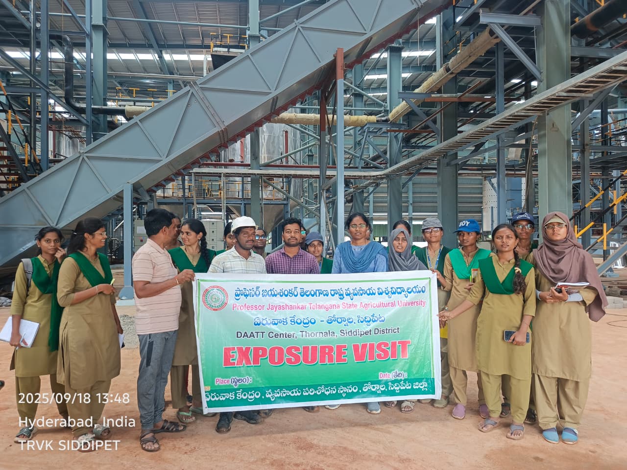 TRVK, Siddipet organized exposure visit of RAWEP students to protected cultivation at Ankshapur (V), Nangunur (M) & TGOILFED Oilpalm factory at Narmetta (V), Nangunur (M) on 18.09.2025. Farmer Sri. Devulapally Venkatesh had explained about Poly house, investment is high, the benefits of controlled climate for year-round cultivation, increased yields, higher quality produce, reduced pest issues, and minimized water and fertilizer. Dr. Ch. Pallavi, Coordinator, TRVK, Siddipet briefed about poly house for students to observe and learn about protected cultivation techniques, such as growing high-value crops in controlled environments like poly houses. These visits provide practical training on poly house management, demonstrate modern farming practices that use less water and pesticides, and facilitate the exchange of information with experts and successful farmers by the students. After that she explained about exposure visits to TGOILFED oil farm factory, seeing them as opportunities for firsthand learning, technology adoption, and practical insights into profitable farming techniques, although some farmers also share challenges like stray animals and the need for better pest management solutions during interactive sessions with the students. These visits provide exposure to successful models, encourage knowledge sharing, and can lead to increased productivity and better livelihoods for farmers. In this programme, 27 No. RAWEP students from BJR, Agricultural College, Siricilla, 05 No. of farmers have participated.
