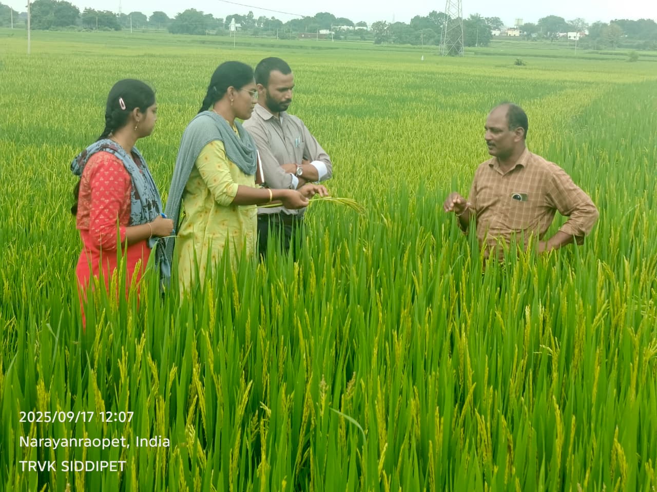 TRVK, Siddipet conducted Field Day on Paddy (JGL-24423) & Green gram (MGG-385) seed production field as the part of QSEV-Quality seed at Every Village programme at Chintamadka (V), Peddagundavelly (V), Pullur (V), Siddipet Rural (M), Ramancha (V), Chinnakodur (M), Gurralagondi (V), Narayanaraopet (M). The Quality Seed in Every Village (QSEV) programme of Professor Jayashankar Telangana Agricultural University (PJTAU) was formally launched in Telangana districts. This initiative aims to promote decentralized seed production by involving local farmers. Dr. Ch. Pallavi, TRVK, Siddipet, Coordinator & Scientist discussed about importance of quality seed production activities done in different villages of Siddipet district for increasing the production and productivity of paddy crop and better management practices to be adopted for enhancing the yield levels. She addressed the importance of pulses in the present scenario to raise awareness and recognize the contribution of pulses to sustainable food systems and healthy food cycle. She further said that the nitrogen-fixing properties of pulses improve soil fertility which increases the productivity and fertility of the fields and also by intercropping Greengram with other crops (Cotton, Redgram and Maize) farmers will get good yields as well as returns within short period of time. Furthermore, pulses can contribute to climate change mitigation by reducing dependence on the synthetic fertilizers used to introduce nitrogen artificially into the soil. In this programme, Mandal Agriculture Officer Naresh, Agricultural Extension Officers Bhuvana, Pradeep, Sumithra, Mounika and 40 farmers were participated.
