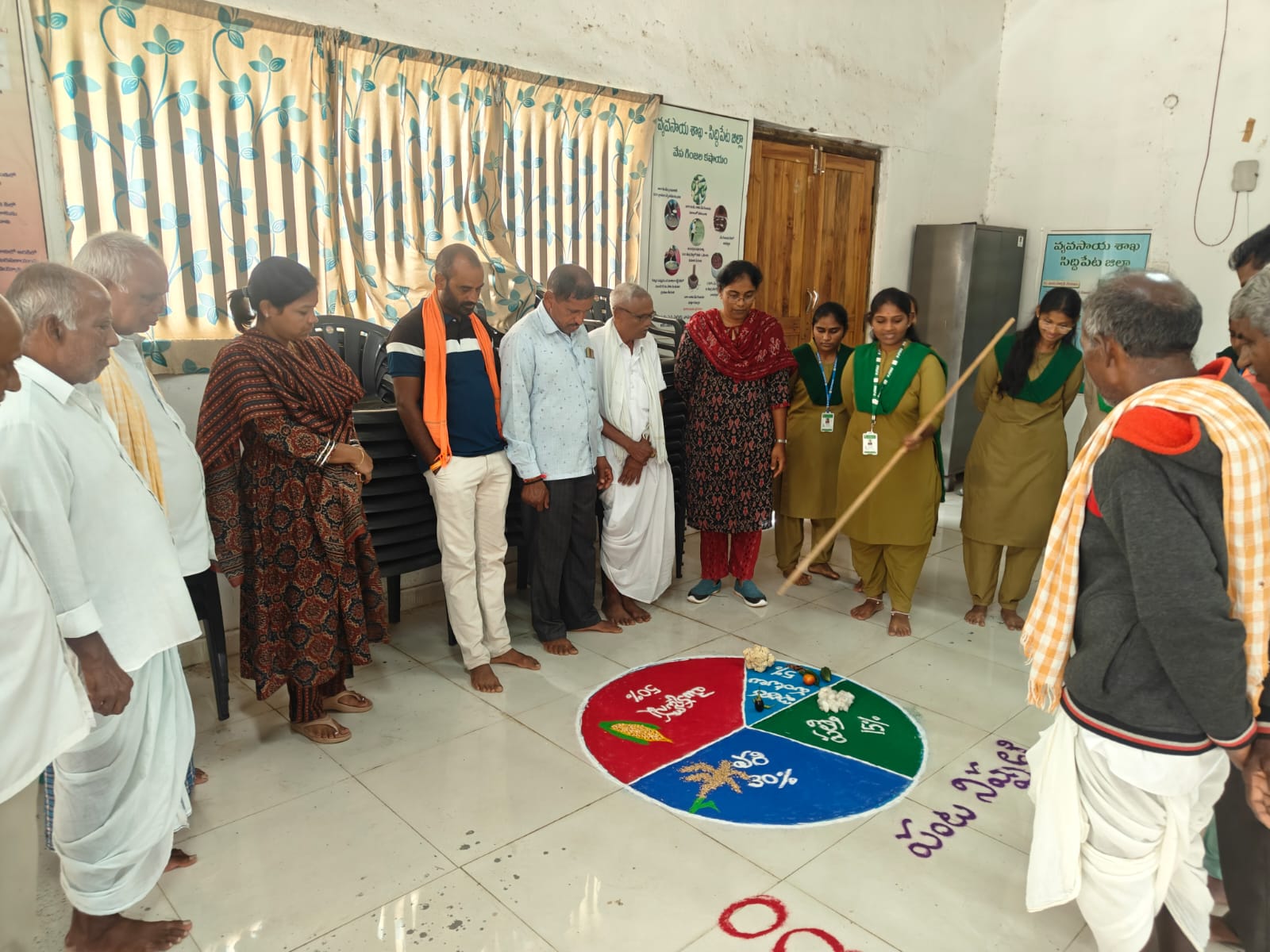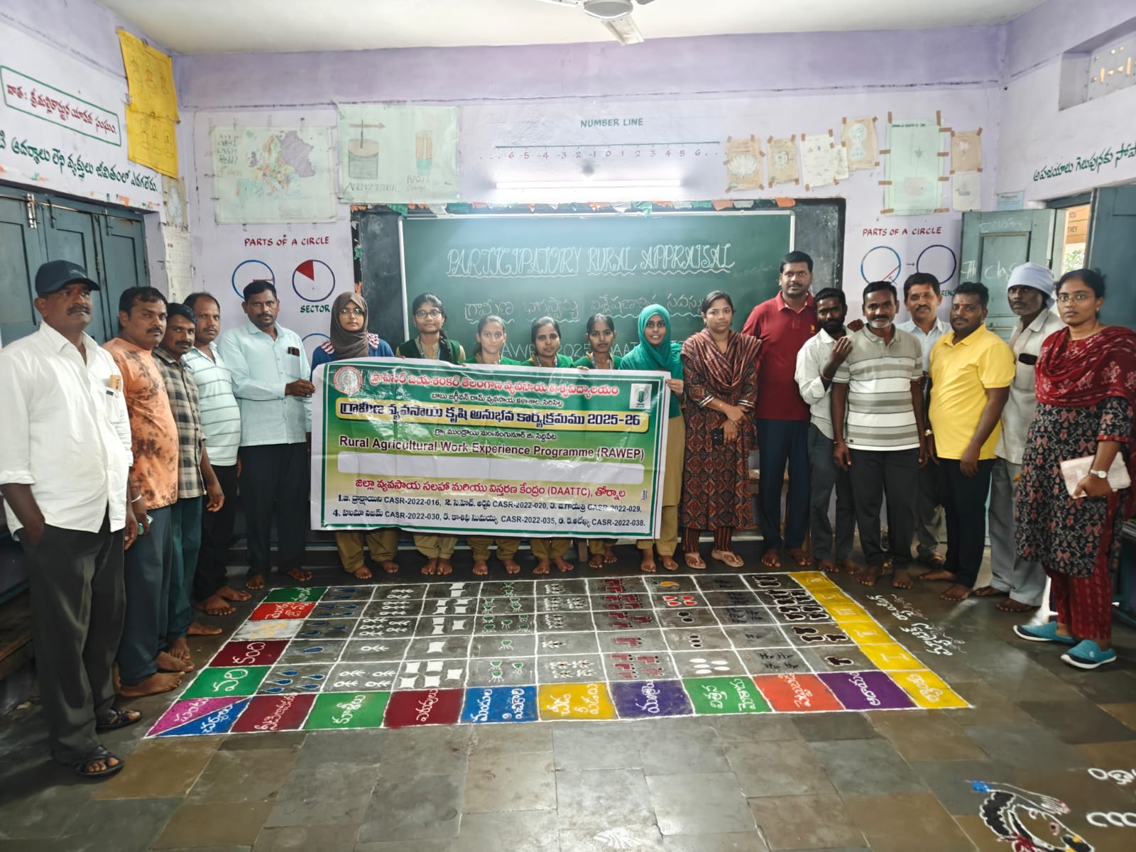 TRVK, Siddipet (formerly DAATTC, Tornala) organised “Participatory Rural Appraisal (PRA)” along with RAWEP students on 18-08-2025 at Ghanapur, Gudikandula, Venkatapur, Mundrai, Ankireddypally villages of Siddipet District. Participatory Rural Appraisal (PRA) is a methodological approach that is used to enable farmers to analyses their own situation and to develop a common perspective on natural resource management and agriculture at village level. It is conducted for identifying the problems for prioritization in the village itself with social map revealing the Layout of the village i.e. houses, roads, village institutions etc., resource map indicating the natural resources of the village. Black soils, red soils, canal, railway line and uplands available in the village, time line Indicating the major events or phenomenon occurred in a village in a chronological order, time trend showing the quantitative changes in different aspects of agriculture (change in the maize yields between 2010 to 2025, seasonal calendar indicating the monthwise activities in agriculture, venn diagram depicting the relationship between village people and the key institutions, Matrix ranking grading things according to their quality or achievements. This technique was conducted to know the crop which is more suitable to this village. The technique indicated that, Cotton is a suitable crop for this village and Preference ranking used for knowing the vague prioritization of problems of farmers. Students and villagers listed out the problems faced by the village people. According to the preference of village people, the health related facilities, transport and labour availability are the major problems in the village. It is an assessment and learning process that empowers farmers to create the information base they need for participatory planning and action. Outsiders contribute facilitation skills and external information and opinions. In this programme, Dr.Ch. Pallavi, Coordinator, TRVK, Siddipet, Dr. Madhavi, Assistant professor, RAWEP students from BJR agricultural college, Sircilla, Agricultural Extension Officers M. Devender, M. Navya, G. Pranyusha, M. Chaitanya and 95 farmers participated.