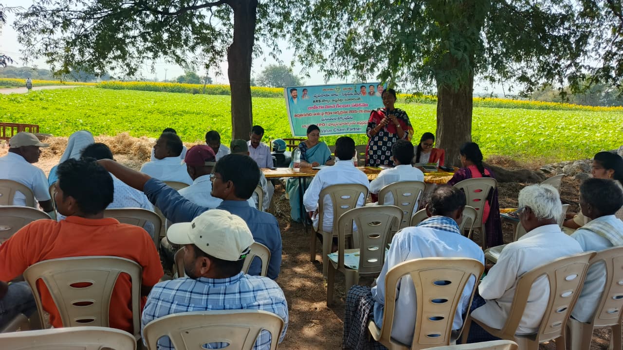 TRVK, Siddipet conducted Awareness and Training Programme on Improved Crop Management Practices in Sunflower at Katkur (V), Akkannapet (M) on 09.02.2026, Siddipet district. Dr. Ch. Pallavi, Scientist (CP) explained about improved cultivation techniques like timely sowing, nutrient management, and pest and disease control practices, micronutrient application, and reducing cultivation costs through need-based input use for achieving higher yields. Farmers were also informed about efficient input use and the role of micronutrients like boron in sunflower cultivation and placing 2-3 honeybee boxes can enhance yields by 10-15%. Later, Ms. Veena Reddy, ADA (Husnabad), informed the farmers that area should be increased under oil seeds which is main motto of NMEO project, further procuring, cold storage and post-harvest oil processing can be established if enough area will be under sunflower through FPO. Later farmers has raised various questions which were clarified by Scientist & Agriculture department staff. In this programme, Talseema Sulthana (MAO) and AEO (Ishwarya, Sabiha), ATMA committee chairman Jangapally Ilaiah, Katkur Sarpanch Balaraju and 50 farmers were participated.