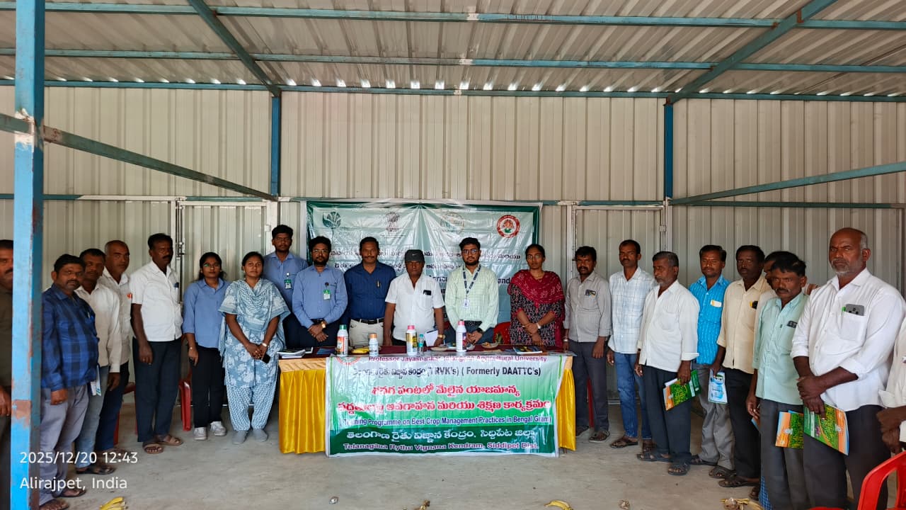 TRVK, Siddipet organised the Training programme on ICM in Bengalgram on 20.12.2025 at Alirajpet village, Jagdevpur Mandal, Siddipet district. Dr. Ch. Pallavi, Coordinator & Scientist (CP), has explained the production practices which are helpful to improve the yields right from sowing to harvesting and given suggestions about on farm mechanization with NBeG -776 variety. She has explained the protection practices against the different pest and diseases which are associated with the Pulse crops especially about Pod borers and wilt. Mandal Agriculture Officer, Sri. U. Vasantha Rao has also suggested the other farmers to take the seed from farmers and grow in next season as the variety is excellent and suitable for combined harvester. A total of 50 farmers and Ms. Sharanya, Agriculture Extension Officer have participated in the programme.