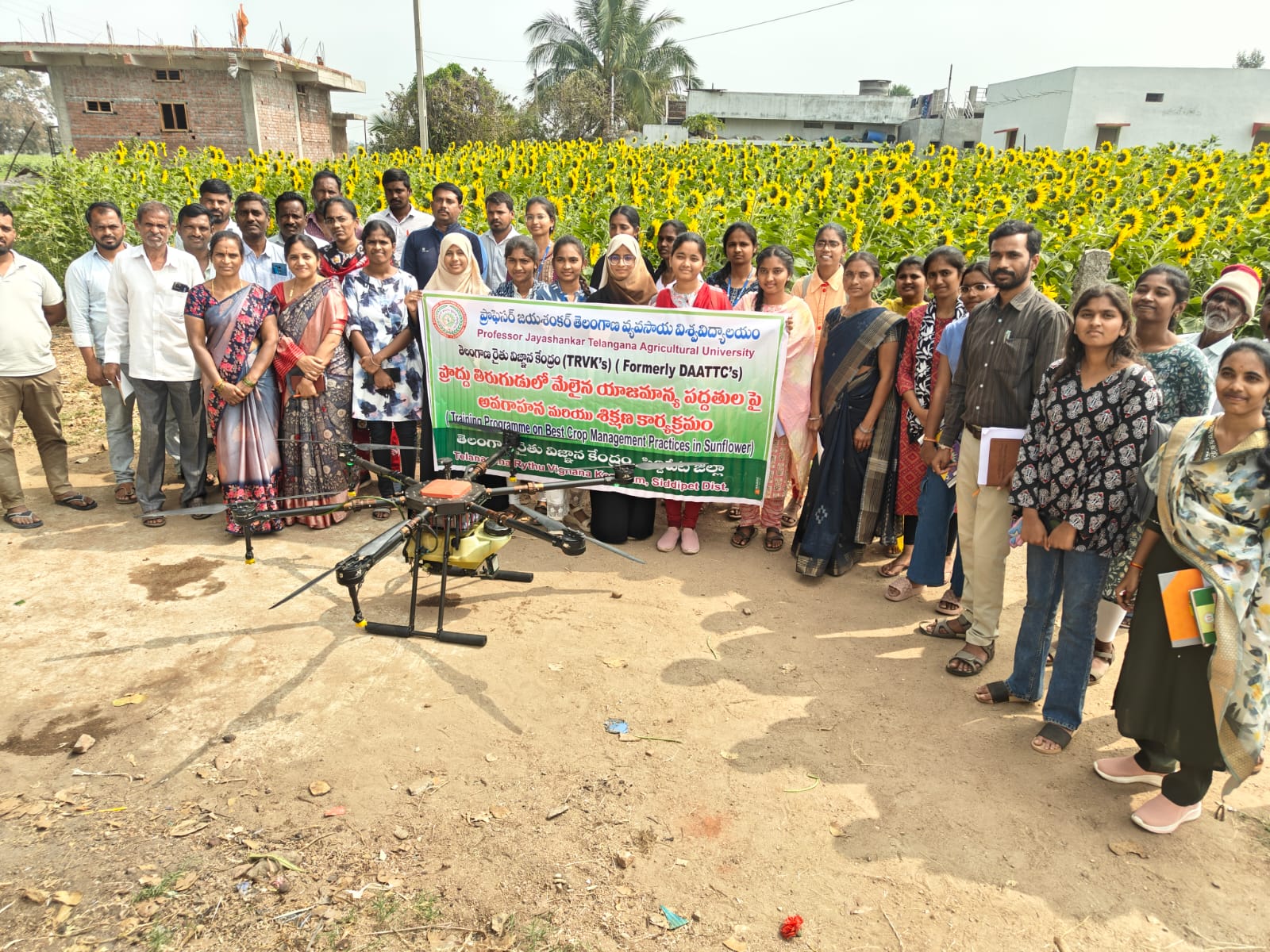 Telangana Rythu Vigyan Kendra (TRVK), Siddipet has organized training programme on Weather based crop management for Rabi season at Bachayapally (V), Siddipet Rural (M), Siddipet (Dt) on 02.02.2026. Dr. S. G. Mahadevappa, Principal Scientist, ACRC, Hyderabad explained about Weather based crop management for Rabi season. Paddy, maize, and sunflower should be sown at the right time, crop damage due to high temperatures and hailstorms during Yāsangi can be avoided, leading to higher yields. He also mentioned that the incidence of pests and diseases would be reduced, thereby decreasing the use of chemical pesticides. He informed the farmers that details about weather changes, five-day weather forecasts, and improved crop management practices are available in the form of bulletins. He advised farmers to use the Meghdoot and Damini mobile applications to get timely updates on weather conditions. Later, Dr. Ch. Pallavi, Coordinator, TRVK Siddipet explained that cultivating alternative crops to paddy such as maize, sunflower, green gram, black gram, sesame, vegetables, and safflower would promote and help in effectively controlling the stem borer pest, which is a major problem. She crop diversification further stated that these crops require less water, have a shorter duration, involve lower investment, and provide higher yields. Later, Ms. Padma, ADA from the Department of Agriculture, informed the farmers that from today onwards, urea booking must be done only through the mobile application, and she explained how to use the app. Later, Method demonstration of Borax in sunflower at button stage with Drone was done involving farmers and RAWEP students. In this programme, Sri. Naresh (MAO) and AEO (Sumithra), Sarpanch Premalatha, Upa sarpanch Aruna and 100 farmers were participated.