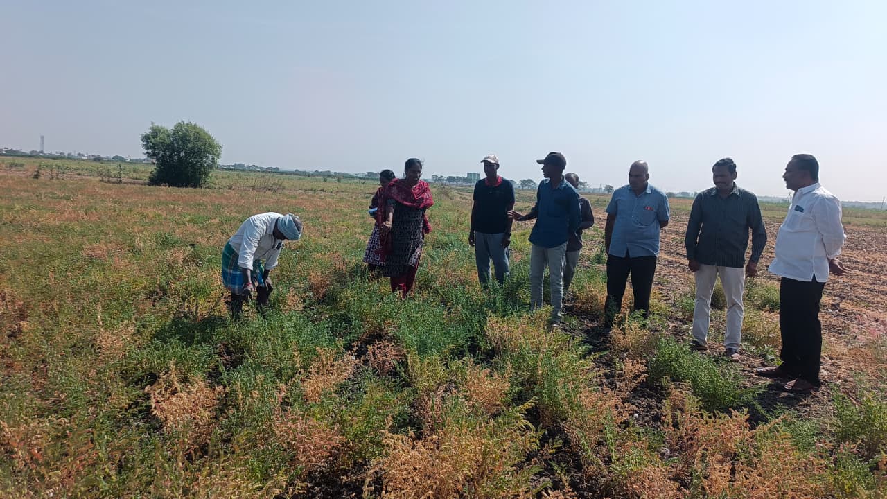 TRVK, Siddipet organized World Pulses Day on 10.02.2026 at Alirajpet village, Jagdevpur Mandal, Siddipet district. The theme for this year’s World Pulses Day was “Pulses of the World: From Modesty to Excellence”. Dr. Ch. Pallavi, Coordinator & Scientist (CP), has explained the importance of pulses in providing essential nutrients for human health. She said that World Pulses Day is celebrated every year on February 10th to highlight the value of pulses. Pulses are rich in protein, fiber, vitamins, and minerals. They support heart health, help regulate blood sugar, and improve immunity. She also stated that pulse cultivation requires low investment and provides better profits. Pulses fix nitrogen in the soil, improve soil fertility, strengthen food security, and help prevent malnutrition. Farmers are earning higher income by cultivating crops like red gram, black gram, and green gram. She advised farmers to reduce the use of chemical fertilizers and promote pulse cultivation. By growing pulses as alternative or intercrops instead of paddy and cotton, farmers can get higher returns with less water and lower investment. Later conducted Field day on New Bengal gram variety NBeG-776 for selective mechanization at Rajamallu Kistaiah farmers field. NBeG-776 is an erect-growing variety with pods borne above the ground, making it suitable for machine harvesting. It is tolerant to dry root rot and can yield about 8–10 quintals per acre with bold seed size. Later Mandal Agriculture Officer, Sri. U. Vasantha Rao has also suggested the other farmers to take the seed from farmers and grow in next season as the variety is excellent and suitable for harvesting with combined harvester. In this Programme AEO- Ms. Sharanya, Alirajpet Sarpanch Yellesh and 20 farmers were participated.