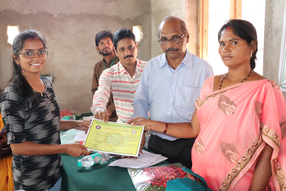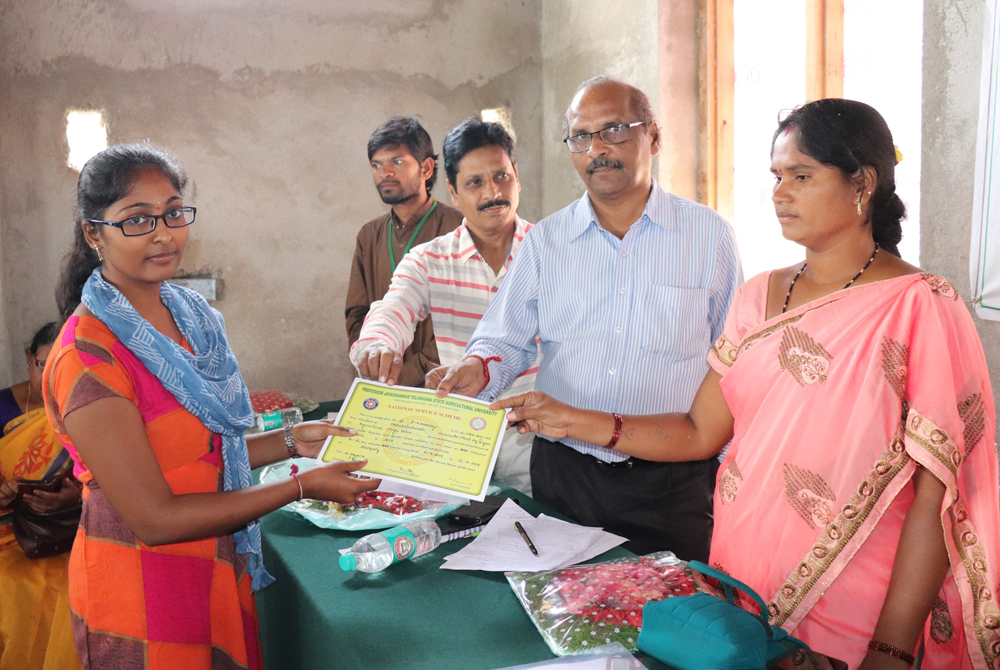Valedictory session of NSS special camp was conducted at Grama panchayat offce, Shainaplly village on 12.09.2019. Dr. D. Vishnuvardhan Reddy, Dean of student affairs (DSA) have attended as chief guest for the programme. Associate Dean Dr. P.Raghu Rami Reddy, along with the staff Mr. K. Rahul Vishwakarma, Assistant Professor (Ento), Dr. T. Archana, Assistant Professor (AEXT), Er. J.Veeranna, Assistant Professor (AENG) and NSS officer, Dr. K. Charan Teja, Assistant Professor (AGRO) and NSS officer, Smt. A. Avanthi, village sarpanch, other elected representatives and final year B. Sc. Agriculture students have participated in the programme. Dr. K. Charan Teja, Assistant Professor and NSS programme officer briefly presented the report on NSS activities conducted during 6th to 11th September 2019 in the village. The students shared their experiences on NSS special camp and thanked Associate Dean, staff, and villagers for their constant encouragement and their support. The villagers Thirupathaiah, Shankar and village secretary Mr. Lakshmi Narayana thanked the university administration and college staff for selecting their village for NSS special camp. They also appreciated sincere efforts of students and promised that they will bring change in the village with the path shown by the students and staff during this week. Then, Smt.Avanthi, Village Sarpanch once again thanked to the university and staff and students for conducting NSS special camp in their village. Later Dean of student affairs, Dr. D. Vishnu Vardhan Reddy along with Associate Dean and sarpanch have distributed certificates to all the NSS volunteers. Dr. P. Raghu Rami Reddy, Associate Dean briefed the gathering about the NSS activities and different programmes conducted as a part of village adoption. He also appreciated the efforts of staff and students during NSS Special camp. He informed that 170 villagers and nearly 400 livestock were treated as a part of NSS special camp. He also mentioned that near about 80 farmers have utilized the farmers training programme. He urged the students to continue service towards the society as a part of life. Later, Dean of student affairs addressed the gathering. In his speech, he thanked village sarpanch, villagers for providing facilities to organise this programme. He also thanked students and staff for their active participation in the programme and bringing change in the village during this camp. He also mentioned that students should habituate of serving the society in their routine life also. He also requested students to serve the forming community and villages and bring good name to the university and Nation. Finally, Er. J.Veeranna, Assistant Professor and NSS officer thanked all the members for their constant support and effort in making NSS special camp a tremendous success at Shainpally.