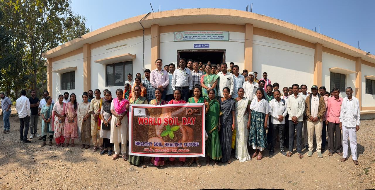 The World Soil Day 2025 was celebrated jointly by Agricultural College, Agricultural Research Station, Adilabad and Centre for People Forestry (CPF) NGO, Adilabad at 2nd year classroom of Agricultural College on 05.12.2025. The programme was anchored by 2nd year student Ms. Arshini who has welcomed the dignitaries on to the dias. The session was inaugurated by dedicating a group song on ‘Save Soils’ by 2nd year students of B.Sc. (Hons.) Ag. The introductory remarks on world soil day was given by Dr. G. Manjulatha, Professor (Agronomy) & OISA, Agril College, Adilabad. She highlighted about this year FAO theme on soils that “Healthy Soils for Healthy Cities” and reiterated the soils play critical role as the foundation for life, supporting food security, biodiversity and climate regulation. Dr. K. Rajashekar, Professor (Ento.), ARS, Adilabad in his address said that every year 5th December marks world soil day, a global initiative by the UN Food and Agriculture Organization (FAO) to shed light on the importance of soil. Sri Sudharsha, a representative of Centre for People Forestry (CPF) NGO, explained about their project initiatives for sustainability. Dr. Sreedhar Chauhan, Principal Scientist & Head, ARS, Adilabad addressed about the programme that soil is a complex ecosystem providing 95% of our food filtering out water, storing carbon and regulating our climate. Dr. Y. Praveen Kumar, Associate Dean, Agril. College, Adilabad addressing the gathering stated that soils, the invaluable resources are facing severe threats from unsustainable farming, deforestation and urbanization making soil conservation, a critical global challenge. Later there was interaction programme between the scientists, Farmers and NGO group farmers. The student Ms. Shradha of II year B.Sc (Hons.) Ag. Spoke on importance on soil conservation. All the Teaching faculty Dr. G. Anitha, Assoc. Professor (Ento.), Dr. Kasbe Sudhanshu S, Asst. Professor (Agro.), Dr. D. Kumara Swamy, Asst. Professor (AECO), G. Anil Kumar, Asst. Professor (GPBR), Non-Teaching faculty and supporting staff of Ag. College, Adilabad and Dr. D. Mohan Das, Scientist, ARS, Adilabad CPF NGO representative Sri. Sudharshan and students of B.Sc (Hons.) Ag. II year participated in the programme. The programme ended with vote of thanks.