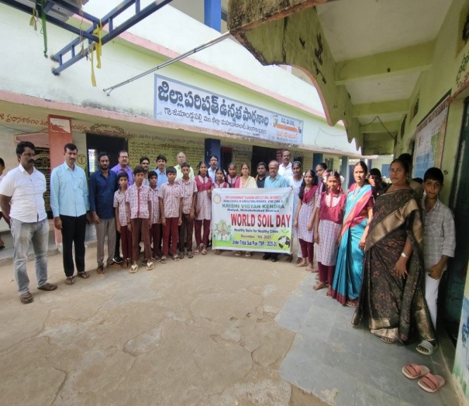 Krishi Vigyan Kendra, Malyal celebrated World Soil Day with the theme “Healthy Soils for Healthy Cities” at Z.P. High School, Jamandlapalli, Mahabubabad Mandal, Mahabubabad districton 5th December. During the programme, Smt. L. Suhasini, SMS (Horticulture), spoke about soil health management practices, minimal use of pesticides and fungicides in Agriculture, water conservation techniques, avoiding plastic usage, and the promotion of organic cultivation. She also explained the importance of soil testing and demonstrated the soil testing procedure to farmers from Kambalapalli village. A total of 60 students from classes 7, 8, and 9, along with 22 farmers, the Headmaster, teaching staff of the high school, and the YP (Cotton Project) participated in the programme.