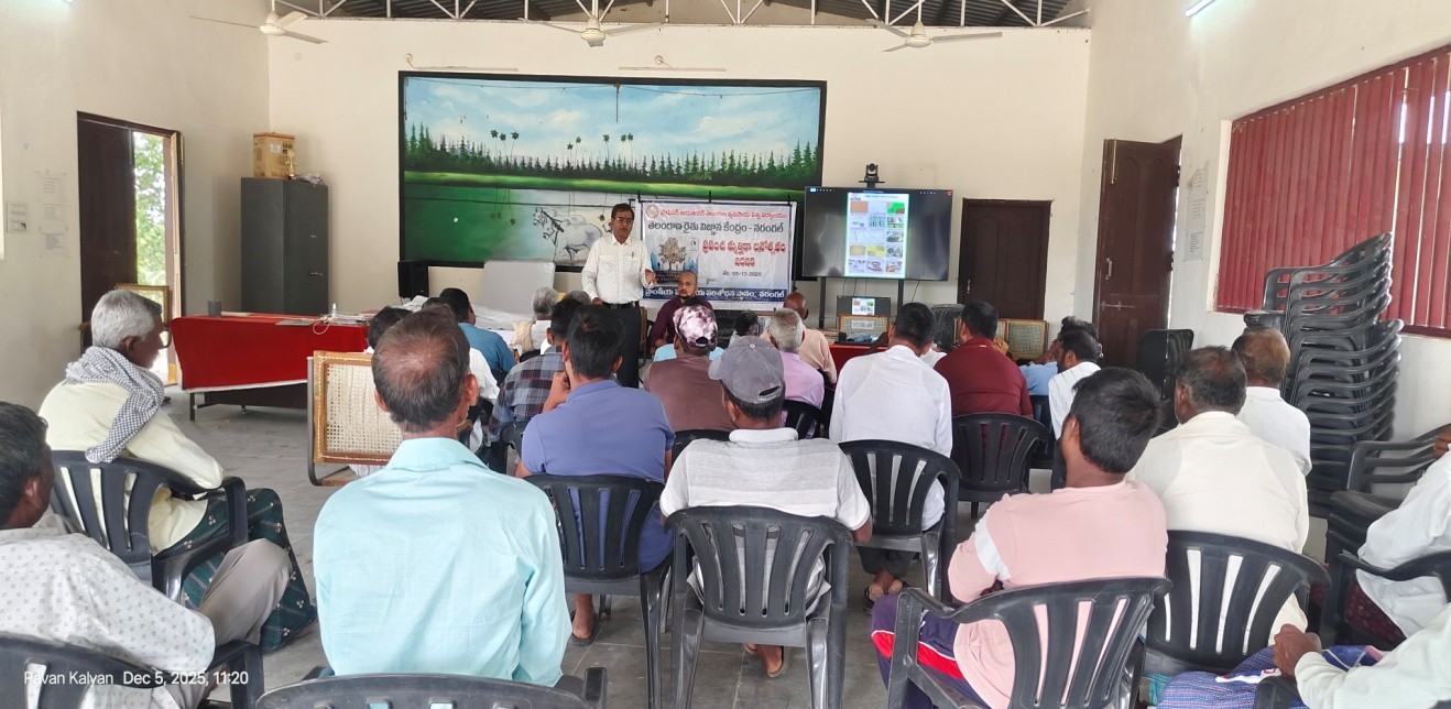Today, on 5th, December, 2025, on the occasion of World Soil Day (WSD), a awareness program was organised by Telangana Rythu Vigyan Kendra, Warangal, in collaboration with the Agriculture Department at Pedda Pendyala village of Dharmasagar Mandal in Hanmakonda District. Speaking on the program, Dr A. Vijaya Bhaskar, Coordinator and Senior Scientist, Telangana Rythu Vigyan Kendra, Warangal, explained this year's theme "Healthy Soils for Healthy Cities" through a "Power Point Presentation". He said that we always think of cities as houses, buildings and roads, but let us not forget that the soil beneath them is the foundation of the health of our villages and cities. He said that these soils absorb rainwater, keep our cities cool, absorb carbon and protect the atmosphere. Also, in this program, a training program was organised for farmers on collecting soil samples for soil testing, pest infestations and nutrient deficiencies management in various crops. In this training, farmers were asked to use fertilizers and pesticides as recommended for the crop and protect the microorganisms in the soil and earthworms. Similarly, farmers were advised to incorporate crop residues into the soil and apply single superphosphate to accelerate decomposition, rather than burning crop waste. They were also advised to sow rice nurseries by December 20th. Every farmer and every citizen should take a "pledge" to play their part in conserving soils and pass it on to future generations. Scientists Dr B. Venkata Rajkumar, Dr R. Vishwatej, along with Mr Rajesh (Dharmasagar, Mandal Agricultural Officer), Agricultural Extension Officer Mr Pawan Kalyan and progressive farmers, participated in this programme.