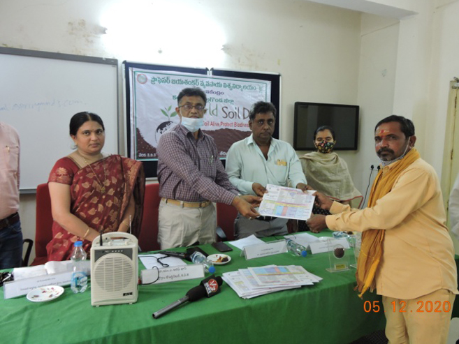 “World Soil Day” was organized and conducted by Krishi Vigyan Kendra, Kampasagar on 05.12.2019. On this event, Dr. M.A. Aariff Khan Programme Coordinator & Head, KVK, Kampasagar inaugurated the programme and addressed the gathering about the importance of Soil Health quality and importance of Soil testing, Organic farming and Soil Biodiversity. Dr. C. Damodar Raju, Head, Agricultural Research Station, Kampasagar focused on soil microbes role in Organic farming which helps in improving soil health and fertility. Dr. K. Sumalini, Vice Principal i/c, Agricultural Polytechnic College, Kampasagar spoke on importance of green manuring and bulky organic manures for better soil quality and crop yield. Shri. Laxmi Narayana, Bayer Crop Science Manager, Suryapet Division explained about importance of Organic manures in improving soil condition and Organic matter content and advised farmers to go for soil testing before every year. Smt. Parvathi Chouhan, Mandal Agricultural Officer, Tripuraram briefed about soil problems due to indiscriminate use of fertilizers and pesticides lead to degrading soil health and microbial population and advised farmers to use Vermicompost, FYM and Poultry Manure for improving soil Organic content. Shri. Veeraswamy, Mitra Foundation NGO, Dr. Reddys Lab, Miryalaguda, Agriculture Division requested farmers not to burn paddy stubbles and straw after harvest at field. In this programme KVK, Scientists Dr. M. Shankar, Dr. T. Bharath, T. Himabindu, S. Pallavi, G. Krishnaveni, J. Jeshwanthi, A. Sai Kiran and Shri. Ramya, Assistant Professor, APT, Kampasagar and progressive farmers (30 No.) from different villages were participated and gave feedback on this occasion. All together 45 members participated in the programme. Finally 300 Soil Health Cards were distributed to farmers by the guests present on the Dias.