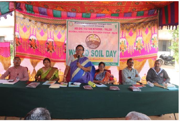 KVK, Palem, Nagarkurnool dist has been organized World Soil Day Celebrations in collaboration with RARS, Palem, Nagarkurnool on 05.12.2022 at KVK, Palem premises. In this regard, KVK, Palem has organized training programme on Soil Health Management to create awareness among the farmers, students about crop residue management, Soil testing & soil test based fertilizer application and vermicompost preparation. Dr.M.Sujatha, ADR, RARS, Palem narrated about the importance of soil fertility, balanced fertilization in enhancing crop yields and sustaining soil fertility through soil test based nutrient management. Dr.T.Shashikala, PS&Head, AICRP on forage crops, ARI, Hyderabad highlighted the importance of soil testing in fertilizer recommendations and explained the benefits of soil health cards. Dr.T.Prabhakar Reddy, Programme Coordinator, KVK, Palem illustrated the importance of crop residue management for enhancement of soil fertility status, methods of composting by using all the agricultural waste. Dr.T.Sukruth Kumar, SS (Soil Science) has stressed about waste management opportunities in rural villages. Dr.RVT Balazzii, PS (Agronomy) stressed on management practices for high forage production. Dr.D.Vijaya Lakshmi, Scientist, RARS, Palem highlighted the importance of waste management, vermicompost preparation for efficient utilization of the waste. Mr.K. Ramakrishna, SMS (Crop Production), KVK, Palem has explained soil sampling procedure and interpretation of results. Later distributed soil health cards to farmers. The programme was attended by farmers, students and all the staff members of KVK and RARS, Palem. A total of 198 participants were participated.